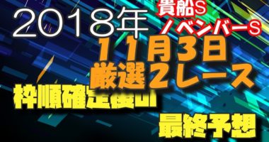 ちゃんねるアキトでございます。この動画は2018年の11月3日土曜日の厳選2レースを予想しています。今回の2レースは、京都10レースの貴船ステークスと東…