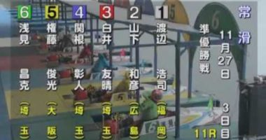 1号艇 渡辺 浩司2号艇 山下 和彦3号艇 白井 友晴4号艇 関根 彰人5号艇 権藤 俊光6号艇 浅見 昌克常滑競艇場、優出者決戦競走 準優勝戦 3日目…
